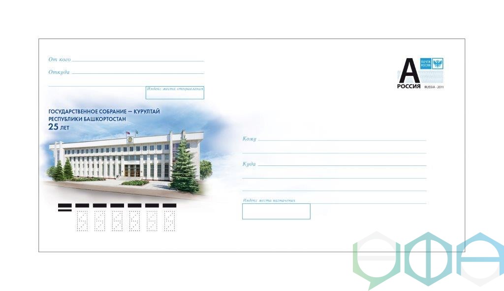 Его выпуск приурочен к 25-летию законодательного органа государственной власти региона. На конверте со стандартной почтовой маркой изображено здание Курултая в Уфе, а также содержится надпись: «Государственное Собрание – Курултай Республики Башкортостан. 25 лет».