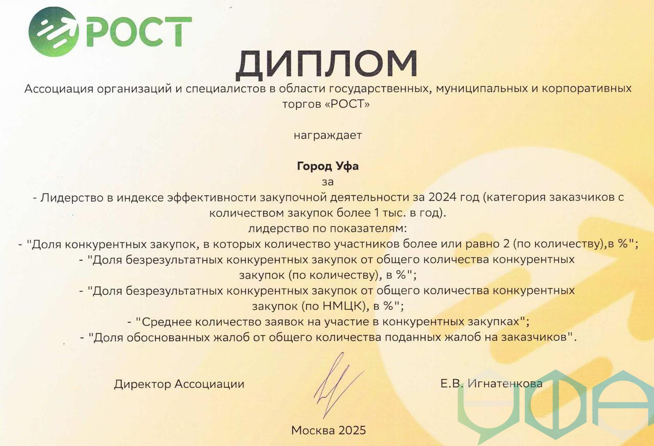 Городская администрация получила высокую оценку на федеральном уровне. Уфа признана лидером индекса эффективности закупочной деятельности муниципалитетов России по итогам 2024 года. Рейтинг составила Ассоциация «РОСТ» — крупнейшее профессиональное объединение экспертов в сфере госзакупок, которое объединяет специалистов из более чем 60 регионов страны.