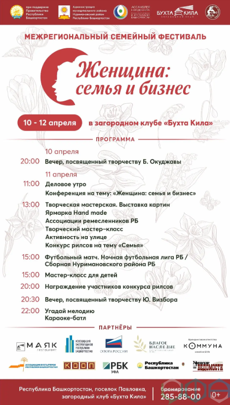 С 10 по 12 апреля 2026 года в загородном клубе «Бухта Кила» (Нуримановский район, п. Павловка) пройдет масштабный межрегиональный семейный фестиваль «Женщина: семья и бизнес». Мероприятие объединит деловую программу, творческие мастерские и семейный досуг.